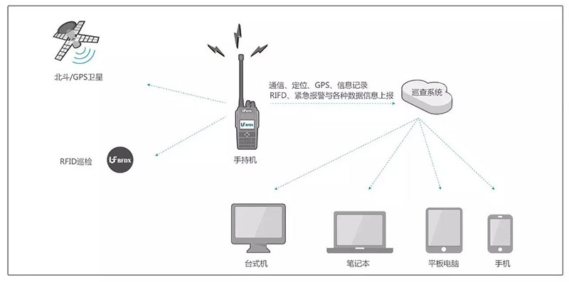 ➤终端机:整合北斗/GPS、蓝牙、RFID、中文语音、时钟芯片等模块、实现各种数据传 输、多种巡查方式 、多级别指挥调度