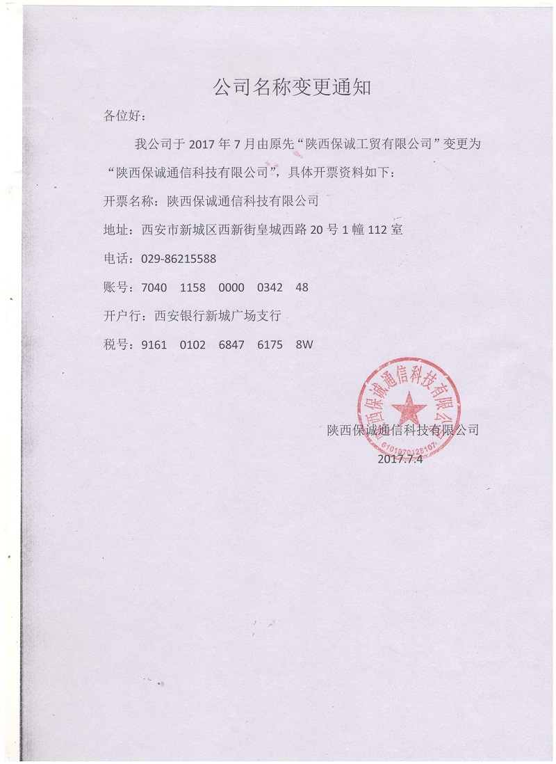 从2017年7月1日开始,本公司名称由原先的“陕西保诚工贸有限公司”变为“陕西保诚通信科技有限公司”