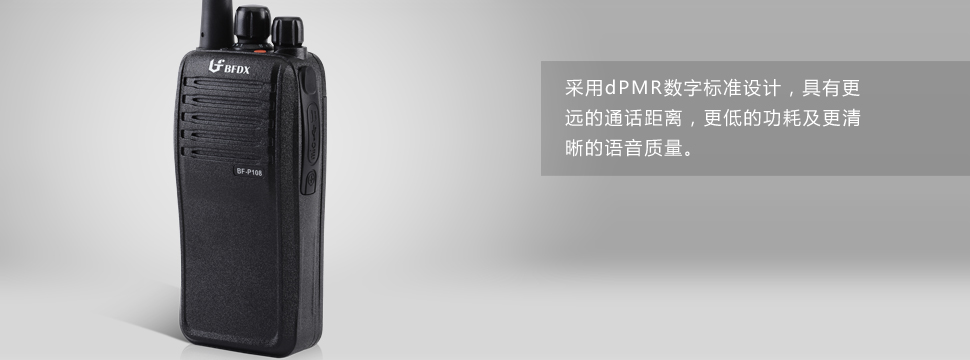 北峰BF-P108,外形内敛沉稳,气质高贵。简约直线式喇叭面盖搭配全面升级的PVC机身面壳,采用国际dPMR数字标准设计,通话距离更远、功耗更低、音质更好。更有独有的触点式耳机接口、封闭式端口保护、创新红色按钮与PTT键功能模块组合等周到的细节设计,为物业对讲机、酒店对讲机、工程对讲机中备受亲睐的专业数字对讲机。