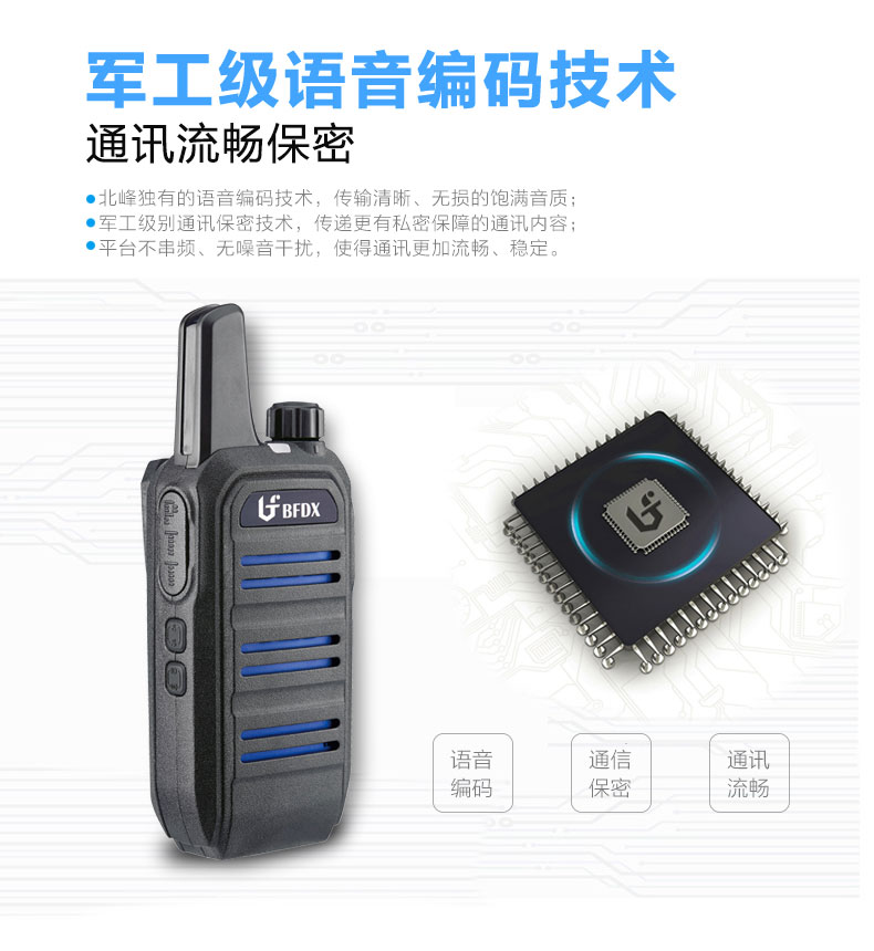 语音编码技术,传输清晰、无损的饱满音质;高灵敏度麦克风,收音功能佳,瞬时响应,声音洪亮;无需紧贴对讲机,即可流畅传递静噪、清晰的通话内容。北峰语音编解码技术,通讯私密有保障。