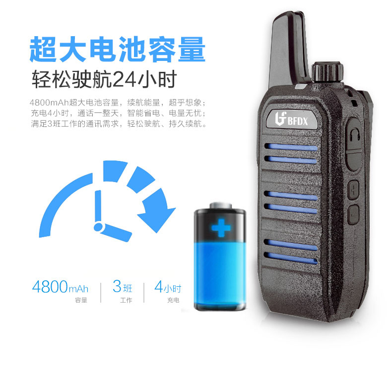 4800mAh超大电池容量,续航能量,超乎想象。充电4小时,通话一整天。能满足日常3班工作的通讯需求,真正实现智能省电、电量无忧。独立的电量播报按键,智能播报电量,充电提醒,避免电量消耗过快带来的不便及烦恼。