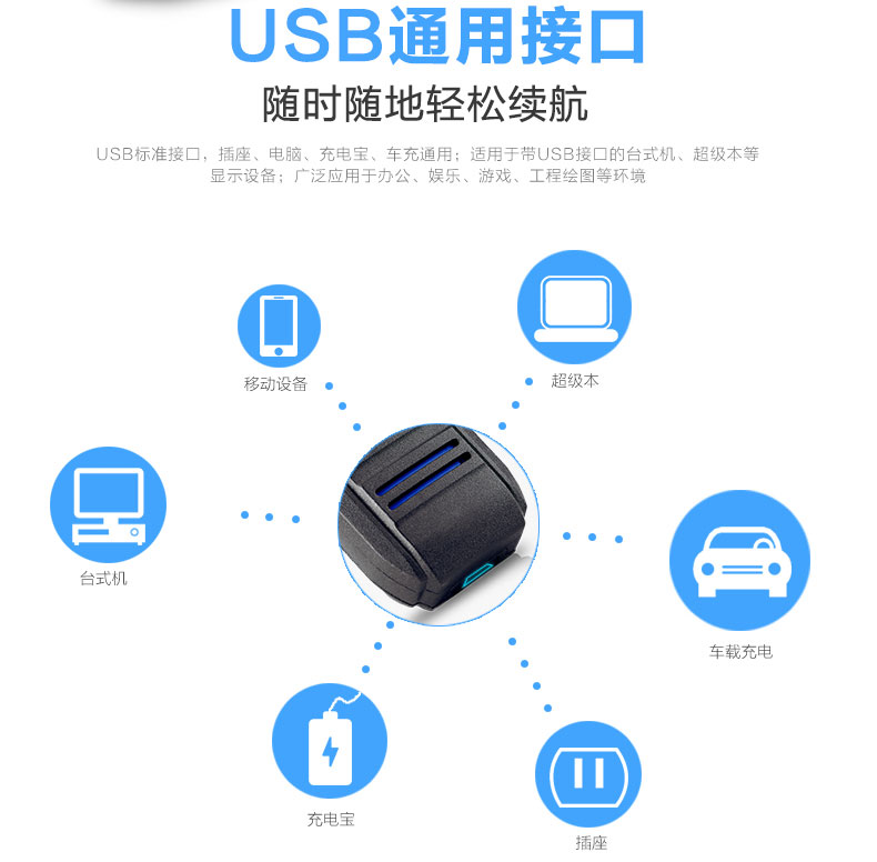 通用的USB标准接口,通用于充电宝、车充充电等各种有USB外接电源的设备,如台式机、笔记本等显示设备,真正实现随时随地轻松续航,避免电量不足和无法及时充电带来的不便及焦虑。