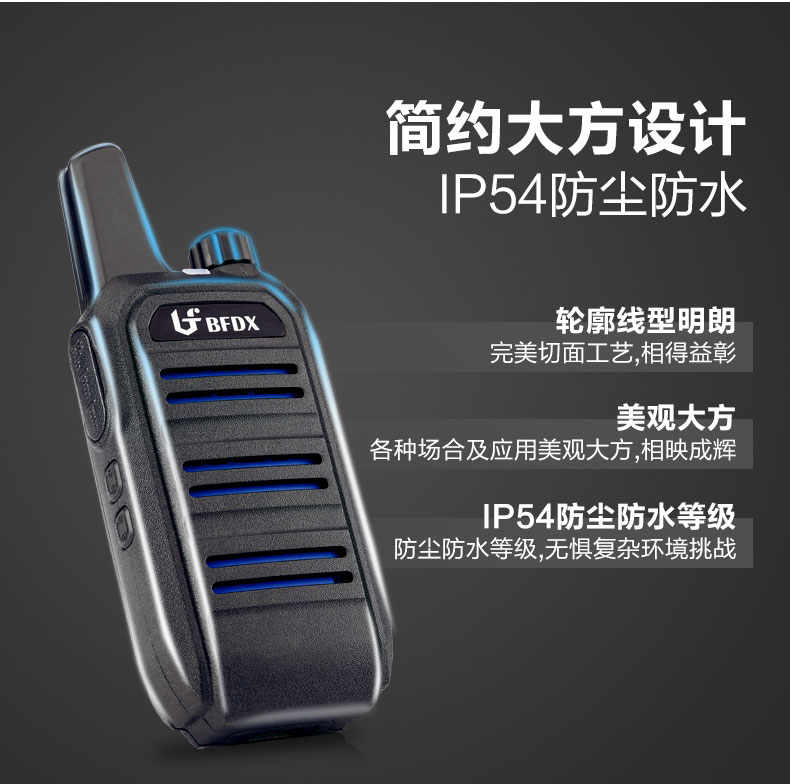 北峰特有的耳机孔防脱落设计,插入后旋转90°即锁定不脱落,极大地为商场、工地及户外等动作频繁的场景提供便利。ID查询快捷按键,可快速识别设备名称;如处于群组模式,还可播报群组名称。轮廓线型明朗,完美切面工艺,蓝色扬声器及灰黑色镂空外观相得益彰。无论是商务场合、工程场地、办公场所、户外应用都美观大方、相映成辉。 其具有IP54防尘防水等级,轻松抵抗户外恶劣环境的干扰,应对户外复杂环境的挑战。
